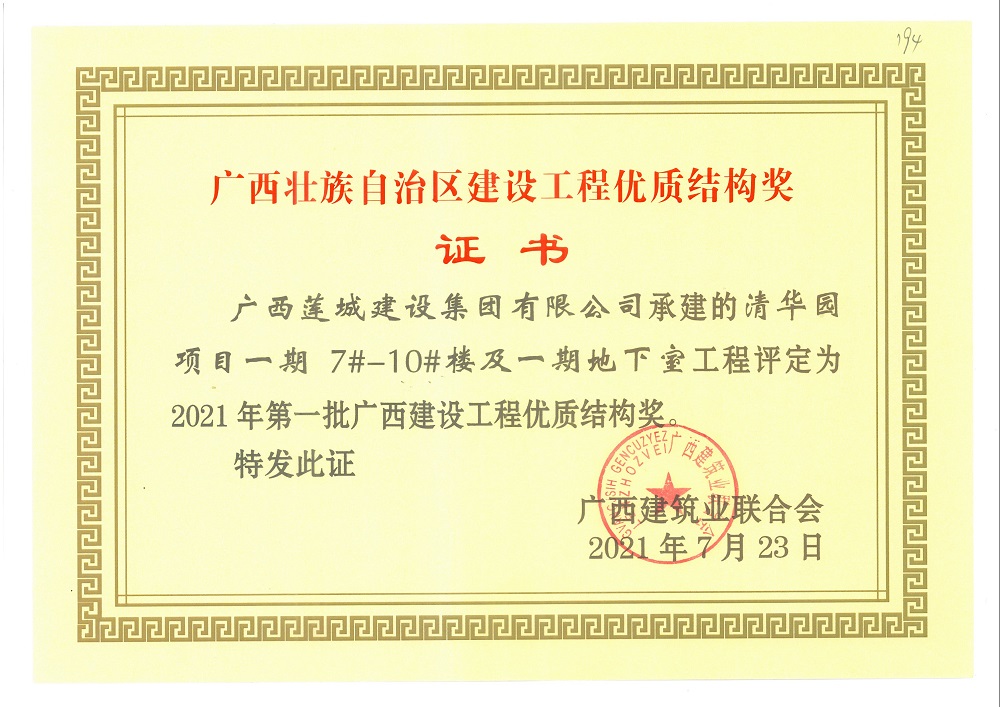 2021年貴港市建設(shè)工程優(yōu)質(zhì)結(jié)構(gòu)獎(jiǎng)蓮城大廈工程,項(xiàng)目經(jīng)理:姜雄雁