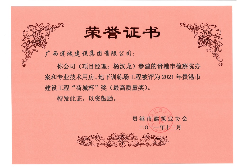 2021年貴港市建設(shè)工程“荷城杯”獎(jiǎng)(最高質(zhì)量獎(jiǎng))貴港市檢察院辦案和專業(yè)技術(shù)用房、地下訓(xùn)練工程,項(xiàng)目經(jīng)理:楊漢龍