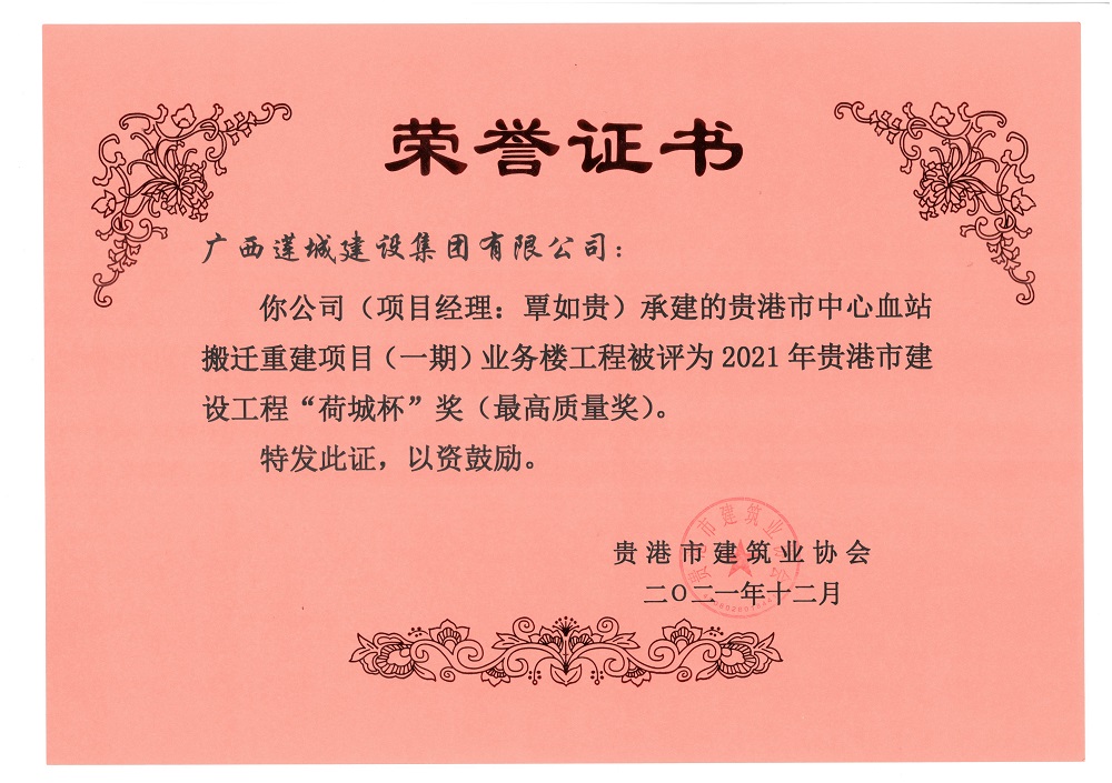 2021年貴港市建設(shè)工程“荷城杯”獎(jiǎng)(最高質(zhì)量獎(jiǎng))貴港市中心血站搬遷重建項(xiàng)目(一期)業(yè)務(wù)樓工程,項(xiàng)目經(jīng)理:覃如貴