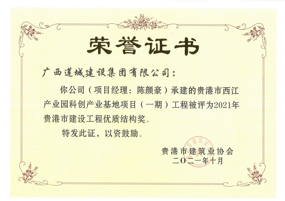 2021年貴港市建設(shè)工程優(yōu)質(zhì)結(jié)構(gòu)獎(jiǎng)貴港市西江產(chǎn)業(yè)園科創(chuàng)產(chǎn)業(yè)基地項(xiàng)目(一期)工程,項(xiàng)目經(jīng)理:陳顏豪