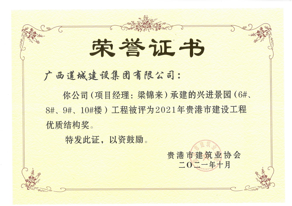 2021年貴港市建設(shè)工程優(yōu)質(zhì)結(jié)構(gòu)獎(jiǎng)興進(jìn)景園(6#、8#、9#、10#樓)工程,項(xiàng)目經(jīng)理:梁錦來(lái)