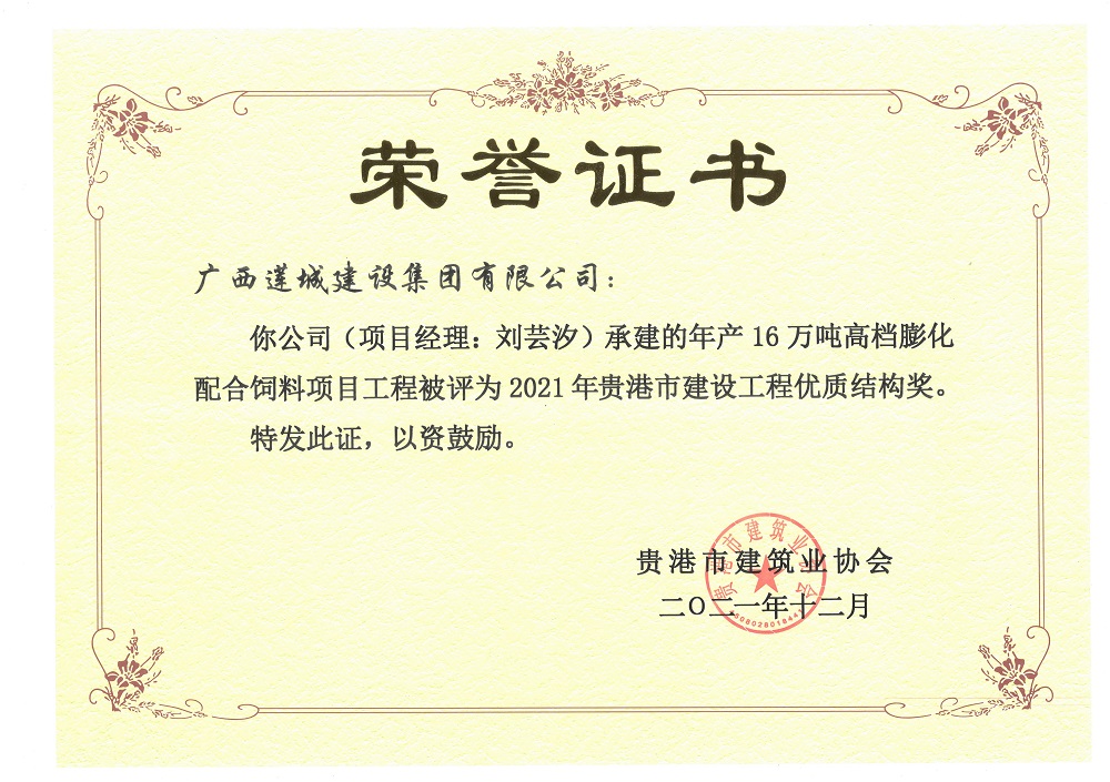 2021年貴港市建設(shè)工程優(yōu)質(zhì)結(jié)構(gòu)獎(jiǎng)年產(chǎn)16萬(wàn)噸高檔膨化配合飼料項(xiàng)目工程,項(xiàng)目經(jīng)理:劉蕓汐
