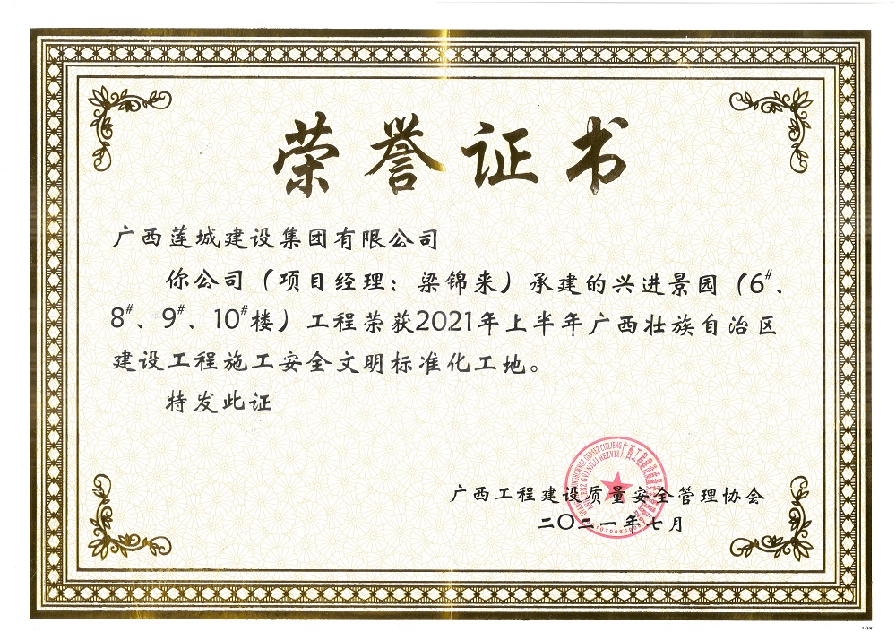2021年上半年廣西壯族自治區(qū)建設(shè)工程施工安全文明標(biāo)準(zhǔn)化工地興進(jìn)景園(6#、8#、9#、10#樓)項(xiàng)目經(jīng)理:梁錦來(lái)