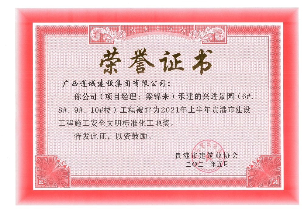 2021年上半年貴港市建設(shè)工程施工安全文明標(biāo)準(zhǔn)化工地獎(jiǎng)興進(jìn)景園(6#、8#、9#、10#樓)工程,項(xiàng)目經(jīng)理:梁錦來(lái)