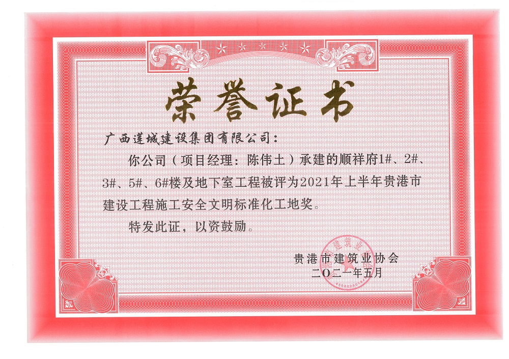 2021年上半年貴港市建設(shè)工程施工安全文明標(biāo)準(zhǔn)化工地獎(jiǎng)順祥府1#、2#、3#、5#、6#樓及地下室工程,項(xiàng)目經(jīng)理:陳偉土