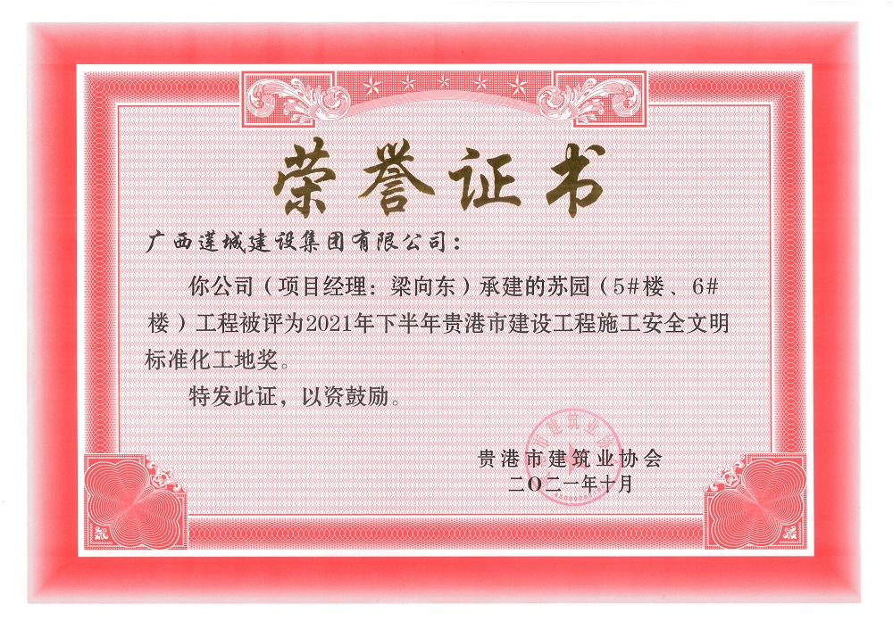 2021年下半年貴港市建設(shè)工程施工安全文明標(biāo)準(zhǔn)化工地獎(jiǎng)蘇園(5#、6#樓)工程,項(xiàng)目經(jīng)理:梁向東