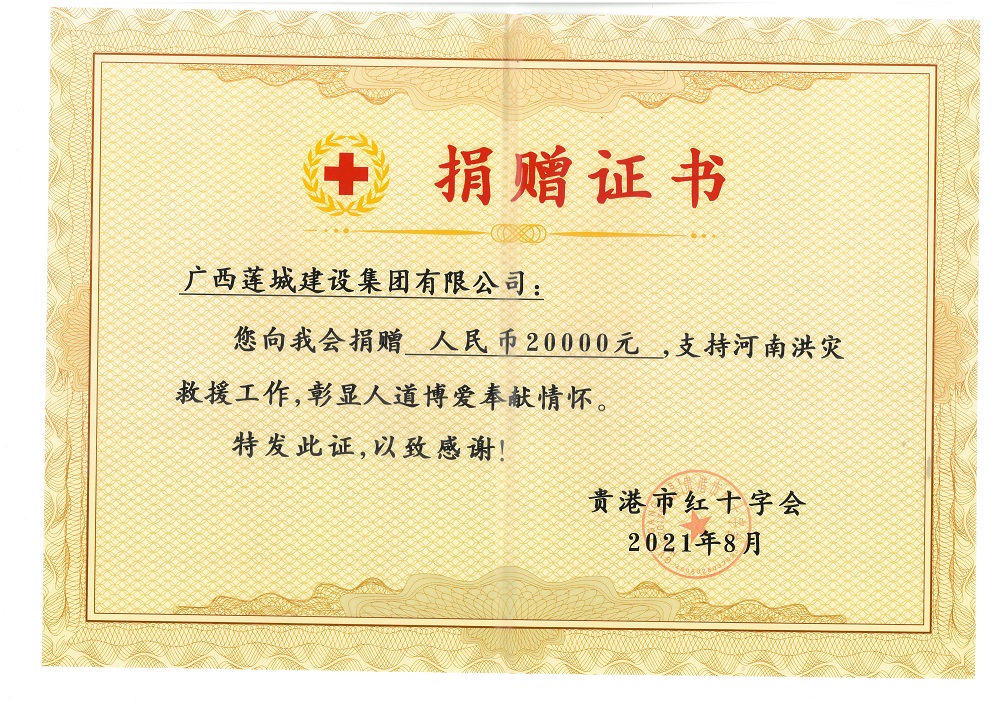 2021年公司向貴港市紅十字會(huì)河南洪災(zāi)捐款,公司捐款20000元