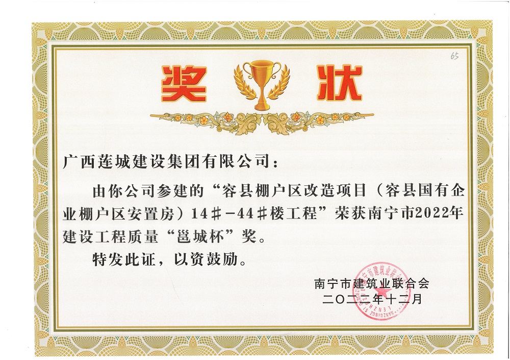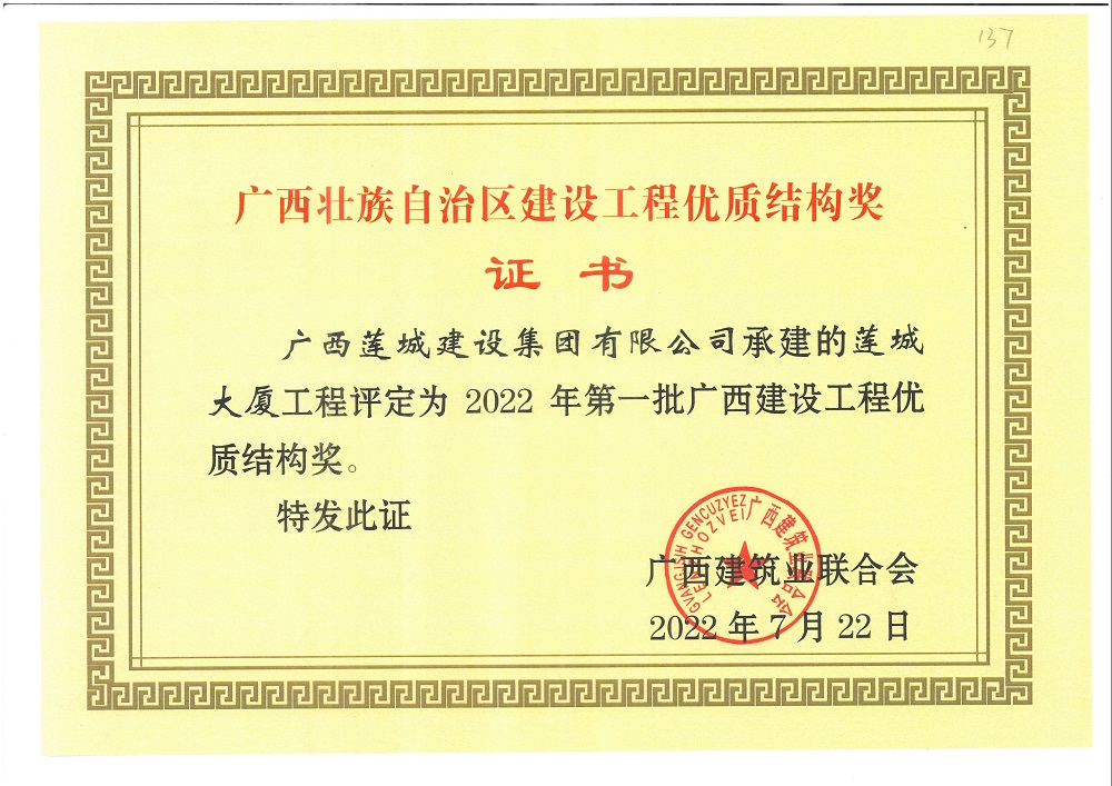 2022 年第一批廣西建設工程優(yōu)質結構獎蓮城大廈,項目經理:姜雄雁
