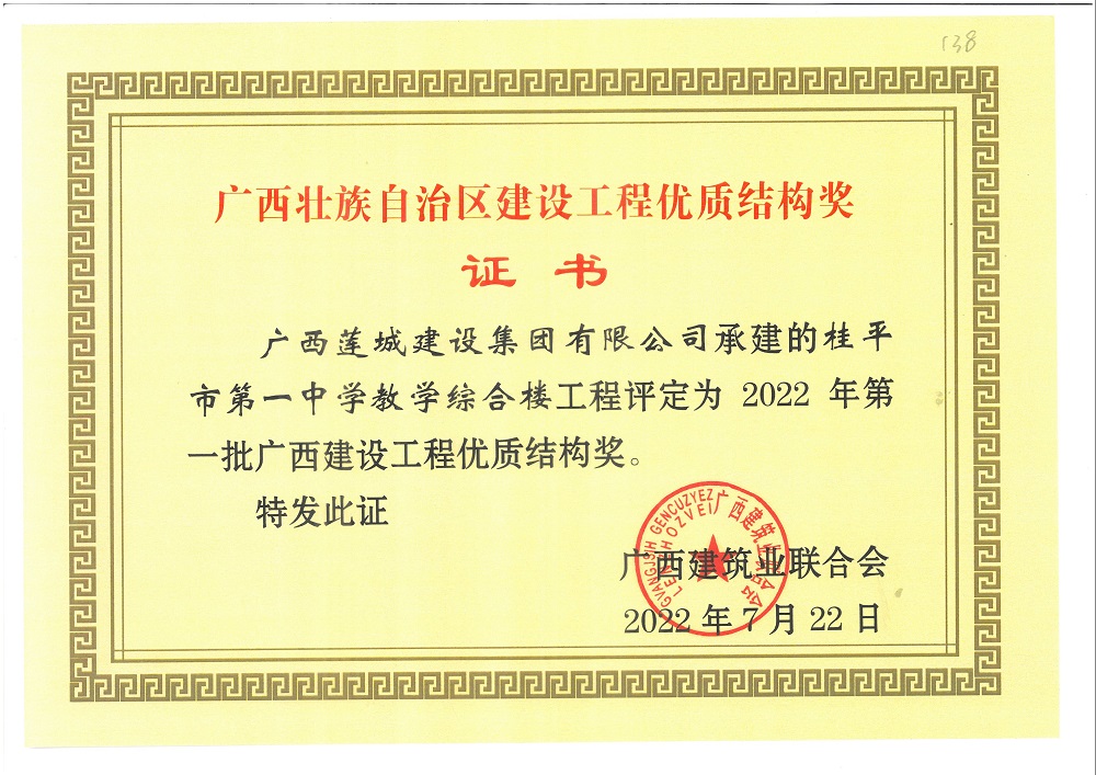 2022 年第一批廣西建設工程優(yōu)質結構獎桂平市第一中學教學綜合樓工程,項目經理:賴尚武