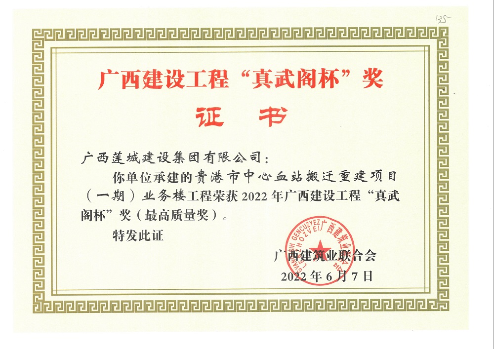 2022年廣西建設工程“真武閣杯”獎(最高質量獎)貴港市中心血站搬遷重建項目(一期)業(yè)務樓工程,項目經理:覃如貴