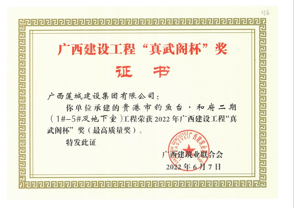 2022年廣西建設工程“真武閣杯”獎(最高質量獎)貴港市釣魚臺和府二期(1#-5#及地下室),項目經理:梁志華