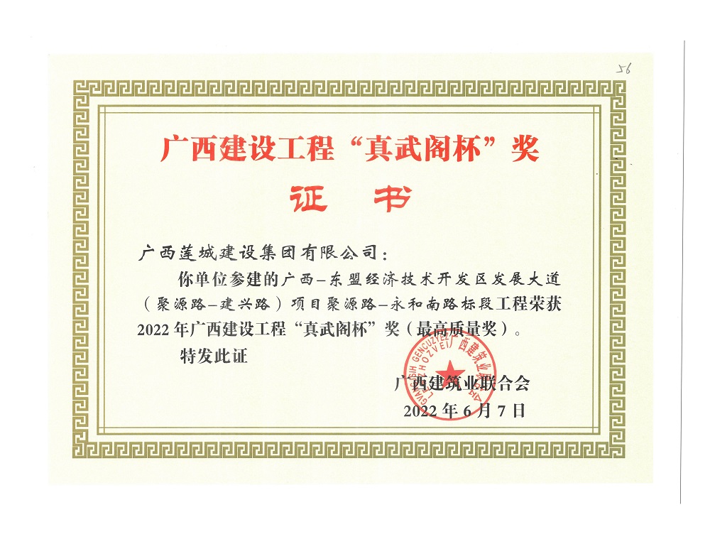 2022年廣西建設工程“真武閣杯”獎(最高質量獎)廣西-東盟經濟技術開發(fā)區(qū)發(fā)展大道(聚源路-建興路)項目聚源路-永和南路標段工程