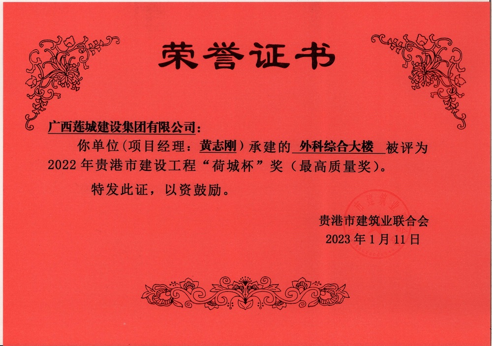 2022年貴港市建設工程“荷城杯”獎(最高質量獎)外科綜合大樓,項目經理:黃志剛