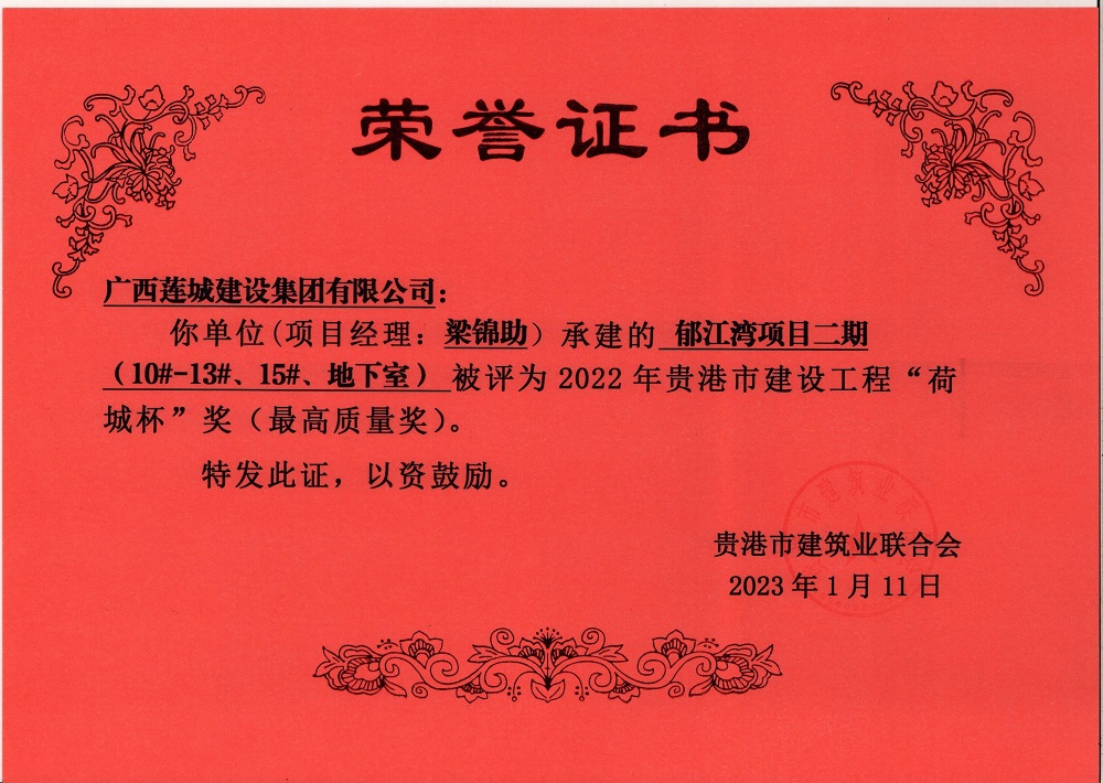 2022年貴港市建設工程“荷城杯”獎(最高質量獎)郁江灣項目二期(10#-13#.15#、地下室,項目經理:梁錦助)
