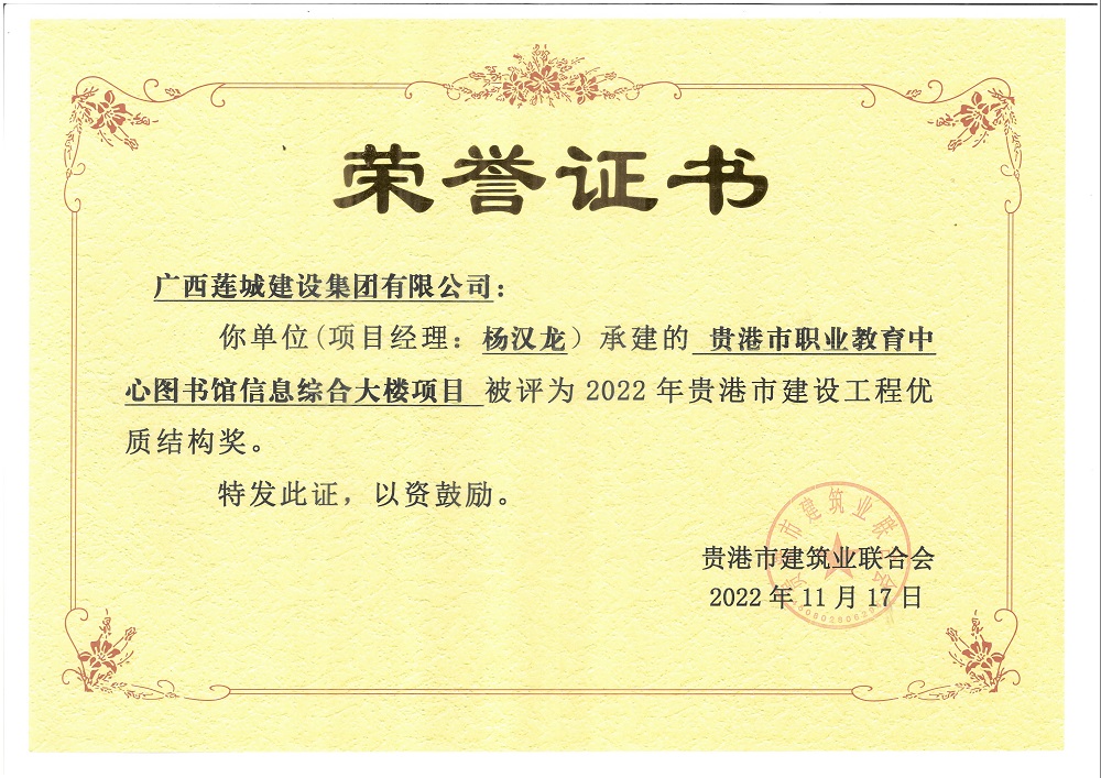 2022年貴港市建設工程優(yōu)質結構獎貴港市職業(yè)教育中心圖書館信息綜合大樓項目,項目經理:楊漢龍