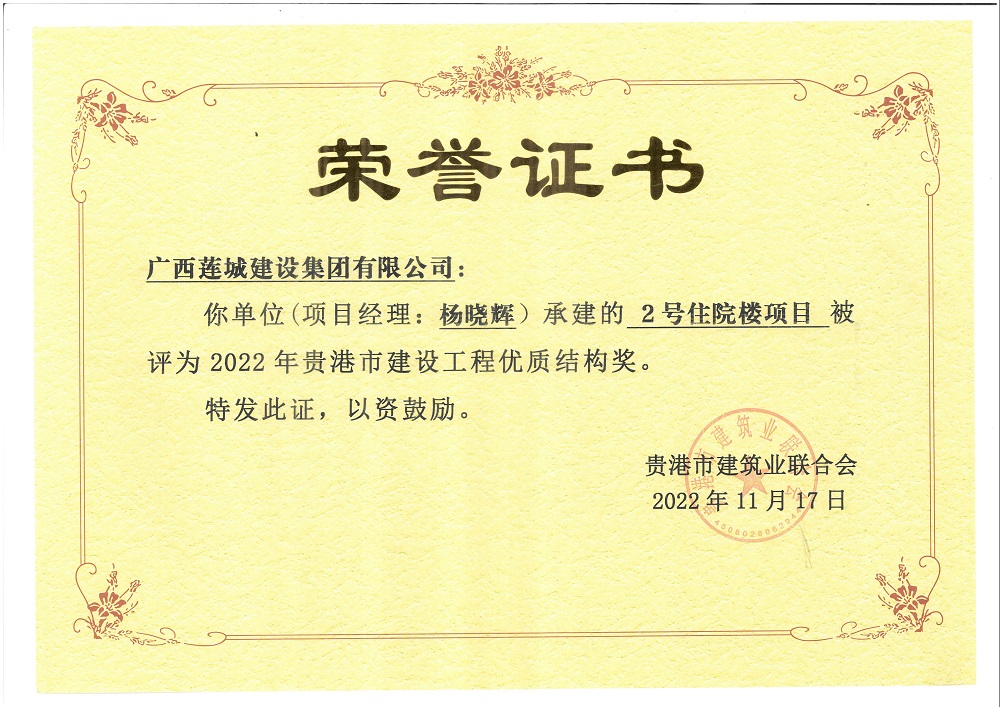 2022年貴港市建設工程優(yōu)質結構獎2號住院樓項目,項目經理:楊曉輝