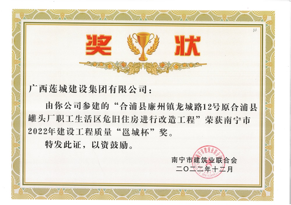 2022年建設工程質量“邕城杯”獎合浦縣廉州鎮(zhèn)龍城路12號原合浦縣罐頭廠職工生活區(qū)危舊住房進行改造工程