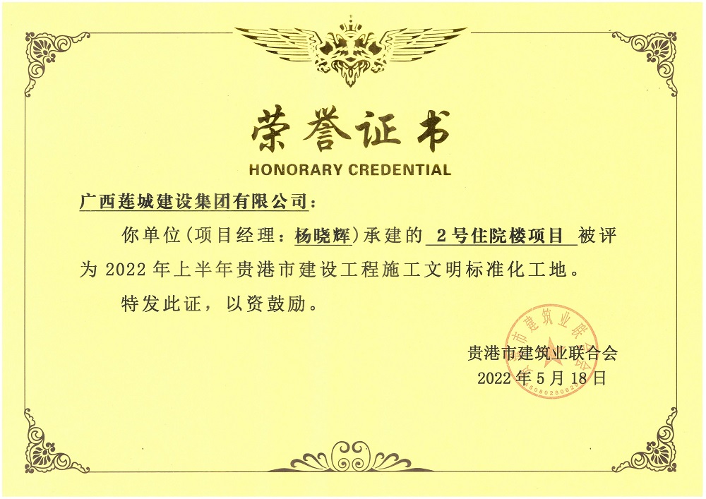2022年上半年貴港市建設工程施工文明標準化工地2號住院樓項目,項目經理:楊曉輝