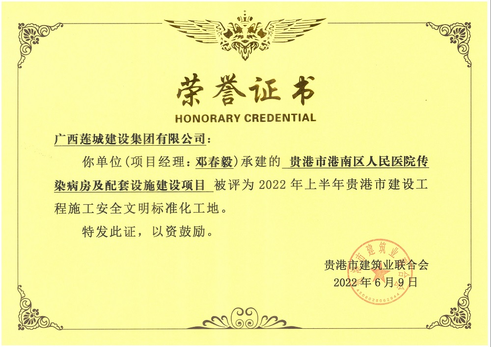 2022年上半年貴港市建設工程施工文明標準化工地貴港市港南區(qū)人民醫(yī)院傳染病房及配套設施建設項目,項目經理:鄧春毅