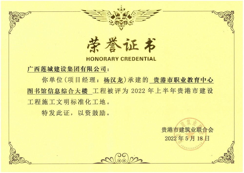 2022年上半年貴港市建設工程施工文明標準化工地貴港市職業(yè)教育中心圖書館信息綜合大樓工程,項目經理:楊漢龍