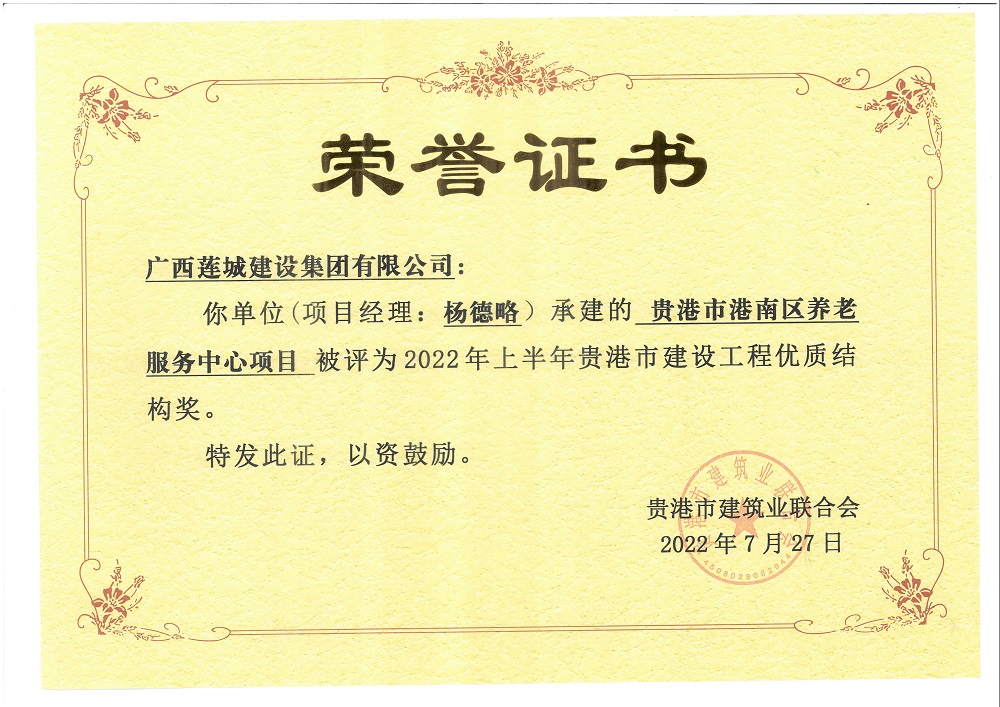 2022年上半年貴港市建設工程優(yōu)質結構獎貴港市港南區(qū)養(yǎng)老服務中心項目,項目經理:楊德略