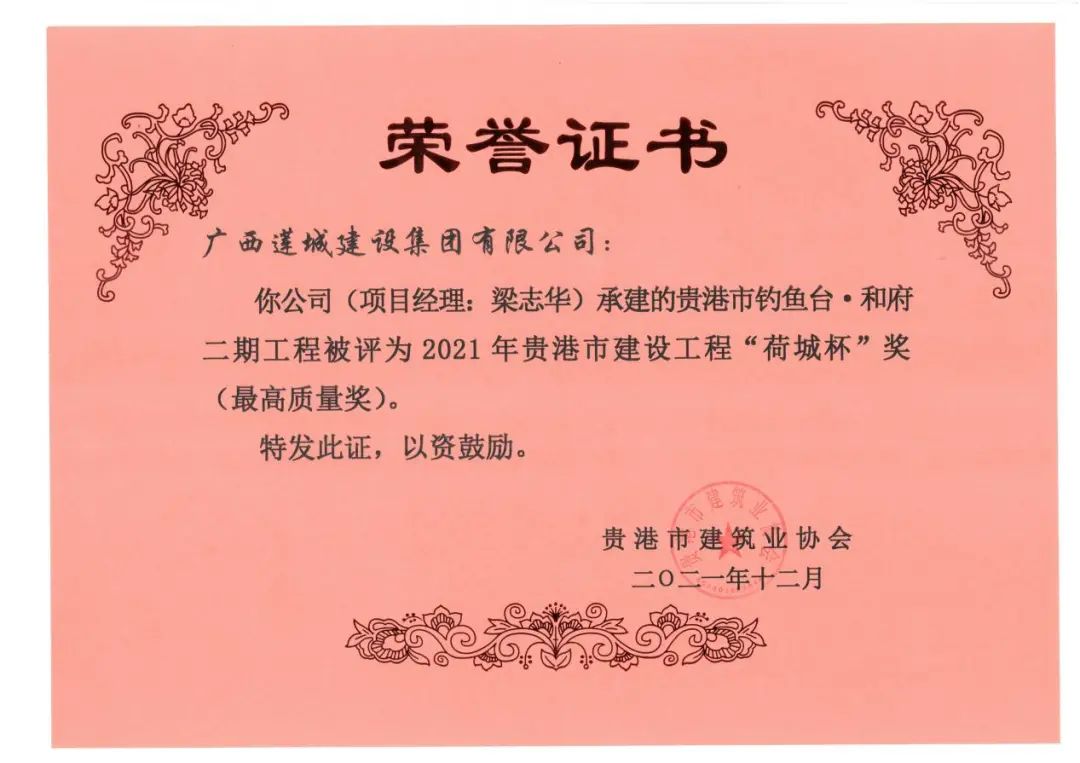 經(jīng)貴港市建筑業(yè)協(xié)會(huì)評(píng)選公示,集團(tuán)公司承建的貴港市釣魚(yú)臺(tái)·和府二期工程,貴港市港北區(qū)高級(jí)中學(xué)教學(xué)樓工程,貴港市港南區(qū)江南消防站項(xiàng)目工程,貴港市檢察院辦案和專業(yè)技術(shù)用房、地下訓(xùn)練場(chǎng)工程,貴港市中心血站搬遷重建項(xiàng)目(一期)業(yè)務(wù)樓工程等5個(gè)項(xiàng)目被評(píng)為2021年貴港市建設(shè)工程“荷城杯”獎(jiǎng)(最高質(zhì)量獎(jiǎng))。
