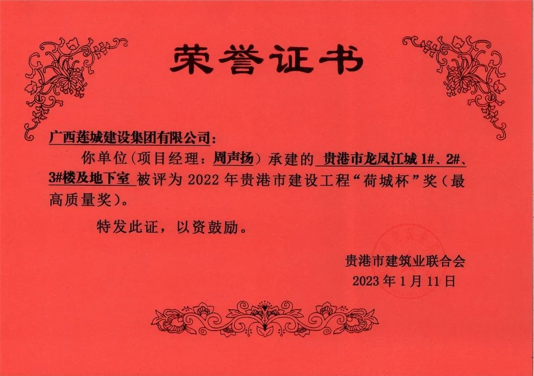 經貴港市建筑業(yè)聯(lián)合會評選公示,由集團公司承建的貴港市龍鳳江城1#、2#、3#樓及地下室,外科綜合大樓,郁江灣項目二期(10#-13#、15#、地下室)項目榮獲2022年貴港市建設工程“荷城杯”獎(最高質量獎)。