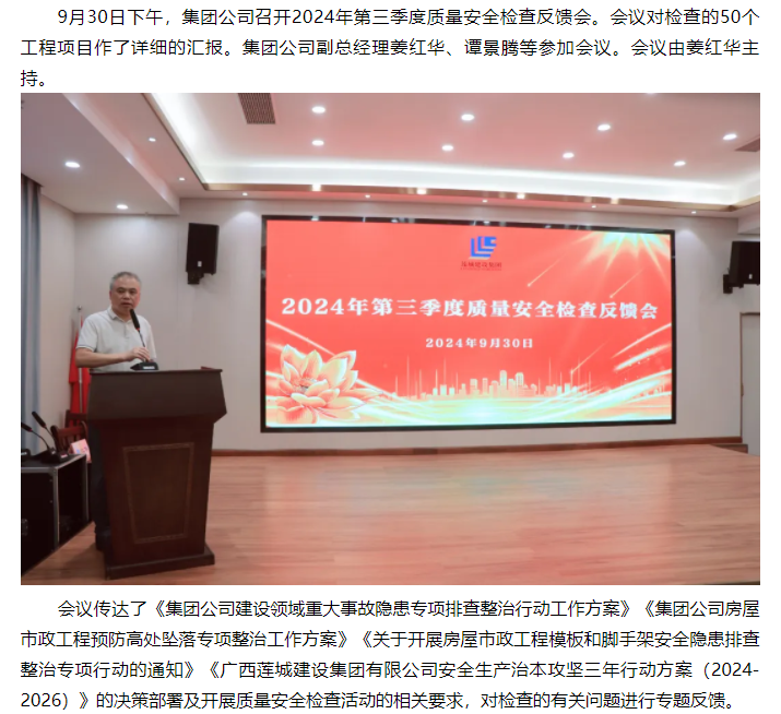 集團公司召開2024年第三季度質(zhì)量安全檢查反饋會