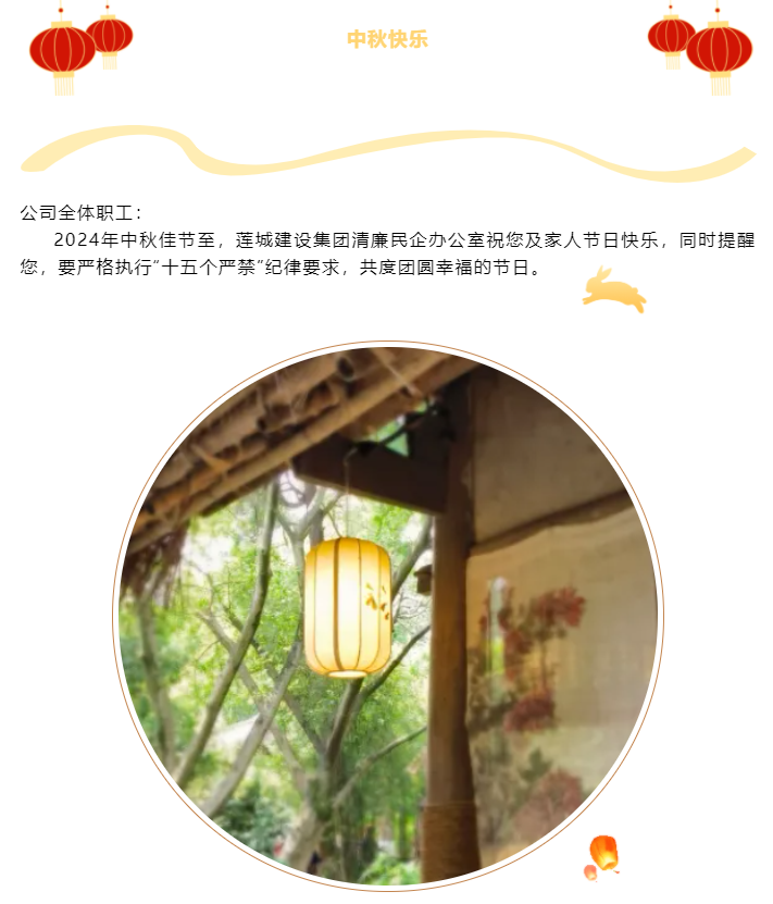 全體蓮城人:一元復(fù)始,萬象更新!值此新春佳節(jié)來臨之際,蓮城建設(shè)集團清廉民企辦公室向您及您的家人致以親切地問候!春節(jié)既是歡樂喜慶的日子,同時也是違紀越規(guī)的高危期,在此,蓮城建設(shè)集團清廉民企辦公室特發(fā)出這封節(jié)前廉潔過節(jié)提醒函,希望全體蓮城人戒奢以儉、廉潔過節(jié)、文明過節(jié)!年關(guān)是人情關(guān),也是廉潔關(guān)。希望大家...