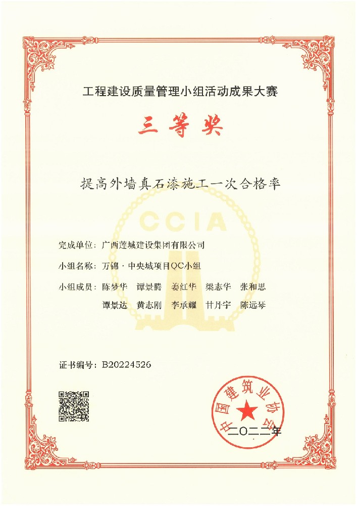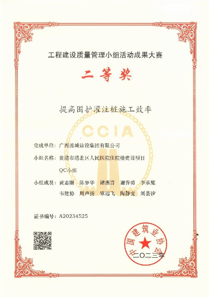 提高圍護(hù)灌注樁施工效率,QC二等獎,貴港市港北區(qū)人民醫(yī)院住院樓建設(shè)項(xiàng)目QC小組成員:黃志剛、陳夢華、譚燕喜、謝喬勇、李承耀、韋建協(xié)、周聲揚(yáng)、覃遠(yuǎn)飛、陶靜雯、劉蕓汐提高旋挖成孔灌注樁施工質(zhì)量合格率,QC三等獎,港南中學(xué)學(xué)生宿舍樓項(xiàng)目部QC小組成員:陳夢華、姜紅華、黃添明、梁志華、陳霖、梁軍、陳熙林、莫智莉、陳遠(yuǎn)琴...