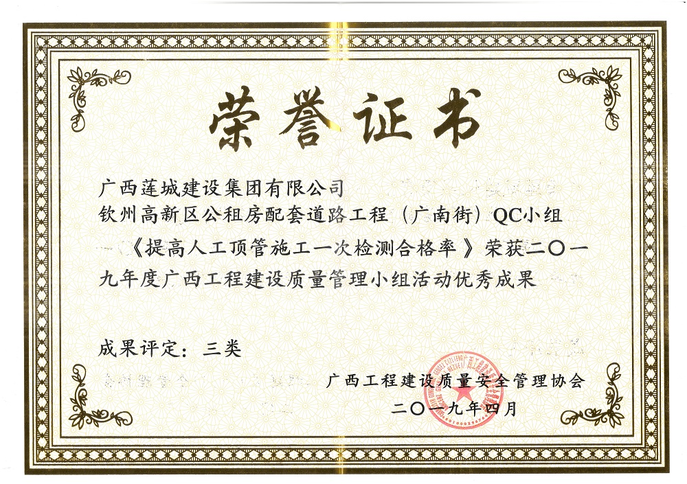 《提高人工頂管施工一次檢測(cè)合格率》欽州高新區(qū)公租房配套道路工程(廣南街)QC三類成果